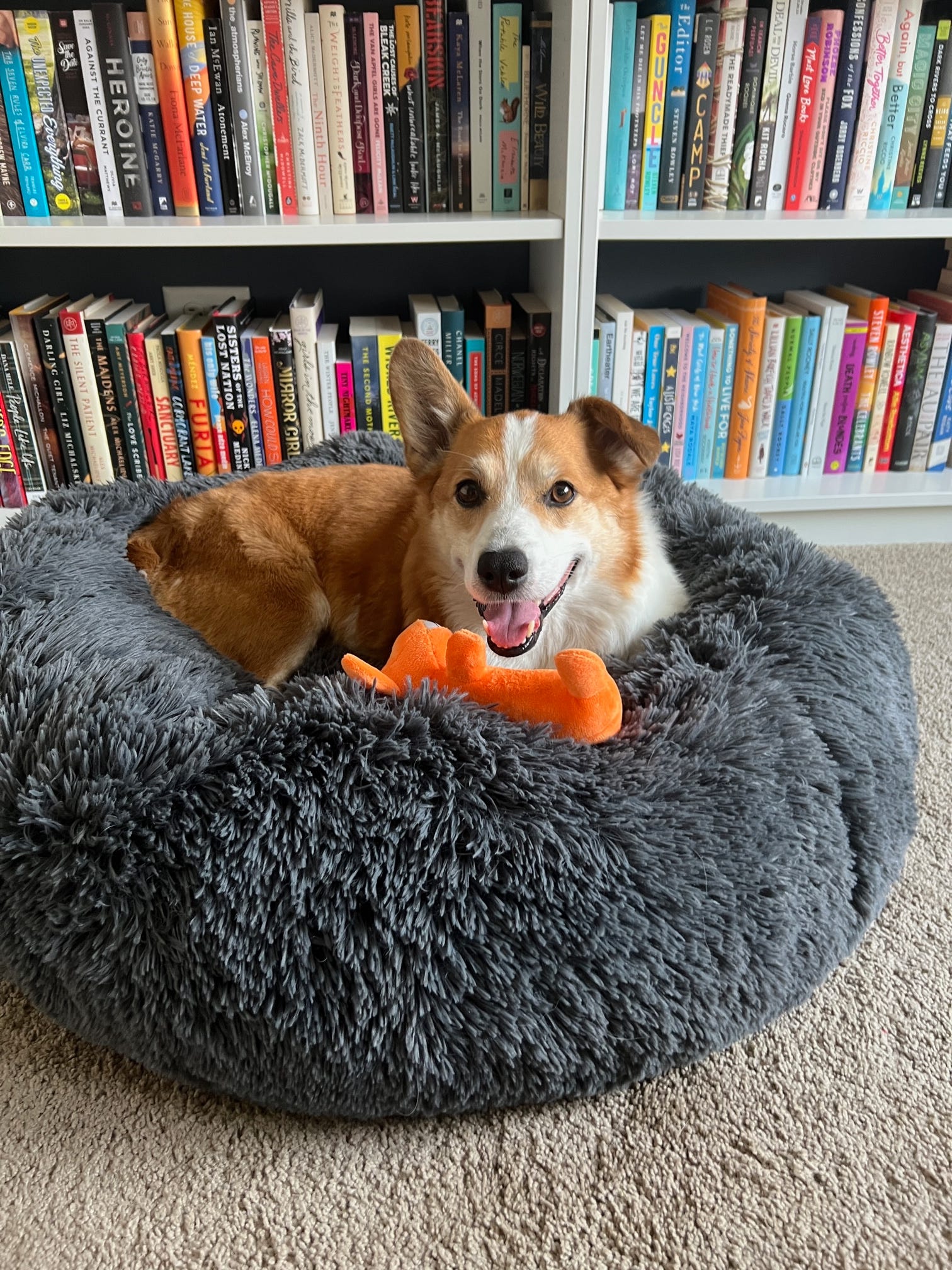 And an obligatory photo of my perfect dog, Digby, posing in front of my shelves, being very useless while I pack and clean.